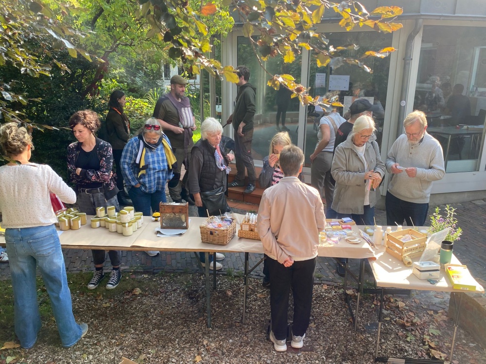 Die Abiturjahrgang des Auricher Gymnasiums bot im Kaminzimmer Kaffee und selbstgebackenen Kuchen sowie Kaltgetränke zum Verkauf an. Der Eiswagen um die Ecke ließ manches Kinderherz höher schlagen. Zur süßen Fraktion gehörten auch Ilse Gerken und Familie Becker, die u.a. Seifen und Rapshonig im Angebot hatten. Nebenbei ließ sich hier per Schaubeute auch ein Blick auf die „Honig-Erzeuger“ werfen.