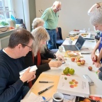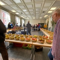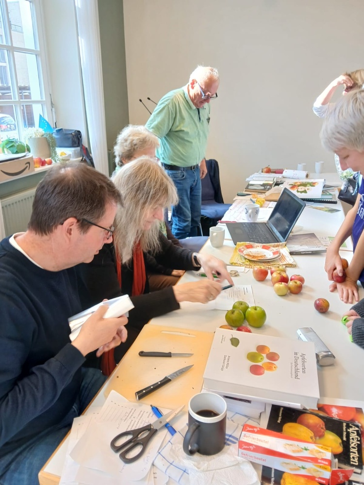 Besonders nachgefragt waren die beiden Pomologen Ariane Müller und Gerold Brüntjen, die zur Unterstützung ihre Kollegen Volker Wiemken und Dietmar Coordes mitbrachten. Als ausgewiesene Spezialisten, die eine Vielzahl von Apfel- und Birnen-Sorten kennen und bestimmen können, waren sie den ganzen Tag gefordert. Manch Apfel stellte sie vor eine knifflige Aufgabe. Ihr habt auch einen Apfel bestimmen lassen? Dann sagen wir Euch und allen, die in der teils langen Warteschlange ausgeharrt haben: „Danke für die Geduld!“.