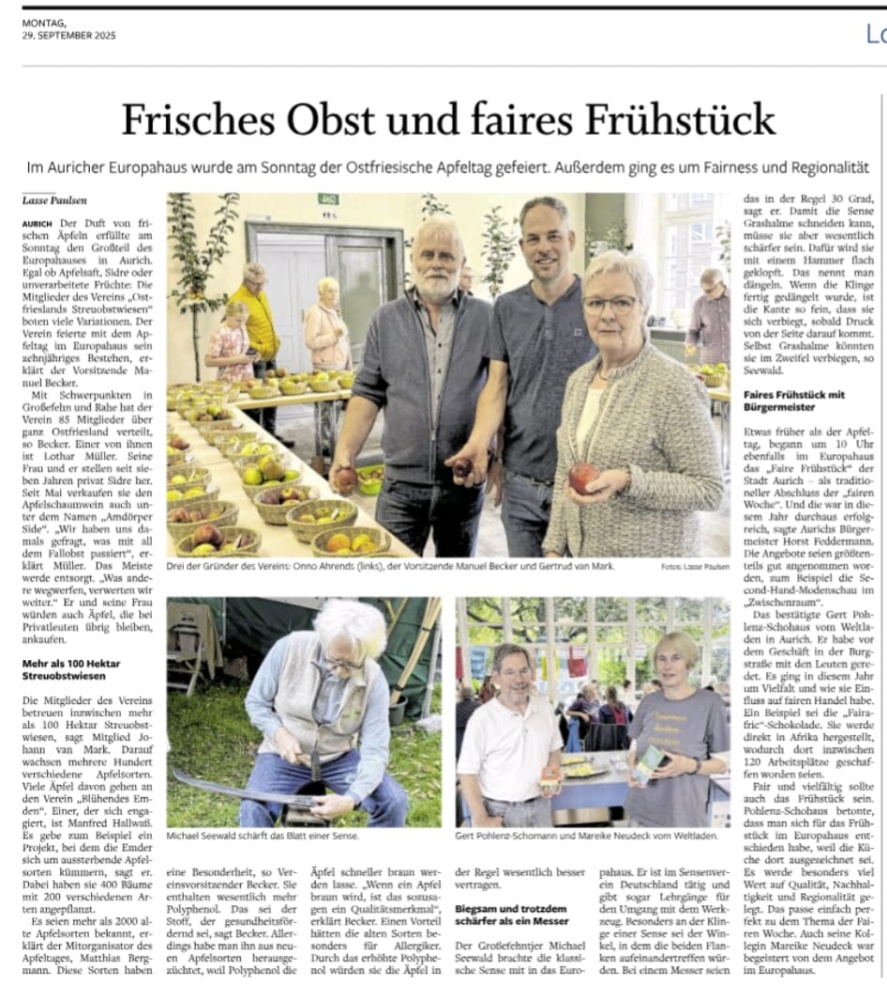 Am 28. September 2025 fand der Apfeltag des Vereins Ostfrieslands Streuobstwiesen e.V. im Europahaus in Aurich statt. Seit der Vereinsgründung sind 10 Jahre vergangen. Anlass genug, dies ausgiebig zu feiern.