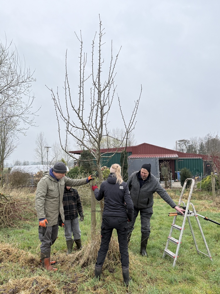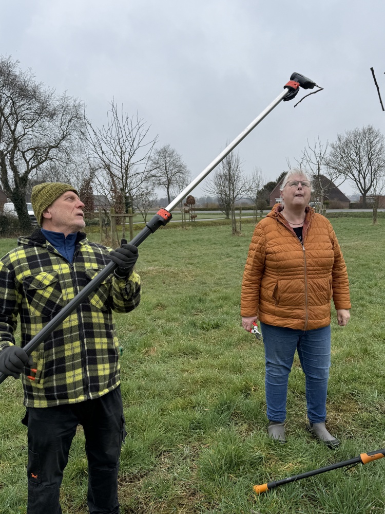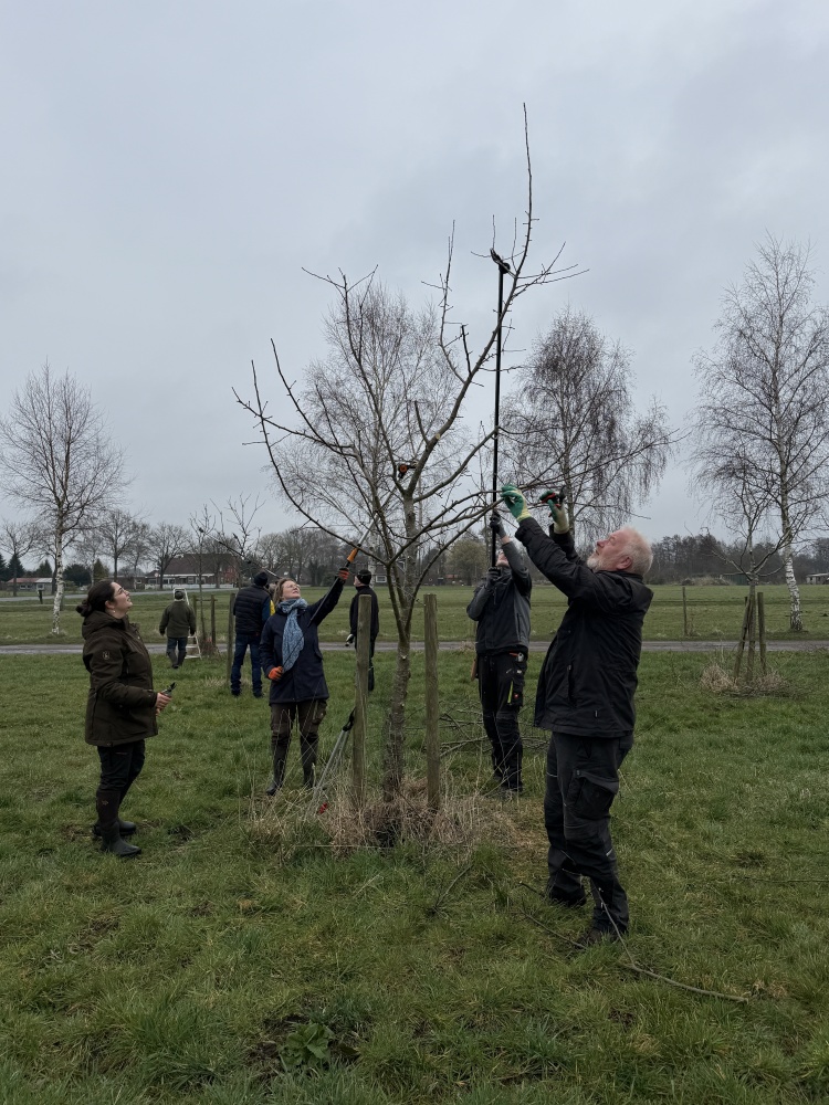 am 14. März 2026 trafen sich Vereinsmitglieder und einige Gäste morgens bei kühlem und regnerischem Wetter auf einer privaten Streuobstwiese in Neu Wiegoldsbur. Die zahlreichen Obstbäume (Äpfel, Birnen, Kirschen, Pflaumen) waren vor ca. 6 Jahren mit Hilfe und unter Anleitung des Vereinsmitglieds Manfred Uphoff gepflanzt worden. Nun war es allerhöchste Zeit für den Erziehungsschnitt. Nach kurzer Vorstellungsrunde und Aufteilung in kleine Gruppen ging es los. Obstbaum für Obstbaum wurde begutachtet und dann geschnitten. Bald schon schwirrten Begriffe wie „Leitäste“, „Fruchtäste“, „Stammverlängerung“ und „Schneidgiraffe“ durch die Luft. Die sehr interessierten Gäste erfuhren theoretisch wie praktisch viel über die Notwendigkeit und die Ausgestaltung des Schneidens. Selbstverständlich konnten sie auch selbst Hand anlegen.