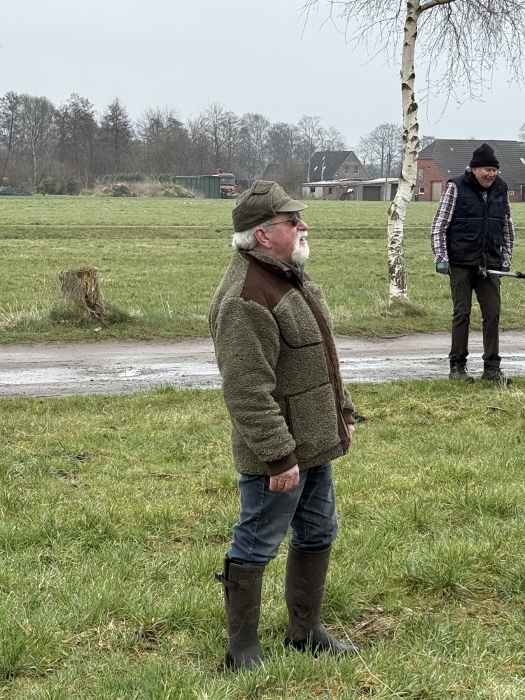 am 14. März 2026 trafen sich Vereinsmitglieder und einige Gäste morgens bei kühlem und regnerischem Wetter auf einer privaten Streuobstwiese in Neu Wiegoldsbur. Die zahlreichen Obstbäume (Äpfel, Birnen, Kirschen, Pflaumen) waren vor ca. 6 Jahren mit Hilfe und unter Anleitung des Vereinsmitglieds Manfred Uphoff gepflanzt worden. Nun war es allerhöchste Zeit für den Erziehungsschnitt. Nach kurzer Vorstellungsrunde und Aufteilung in kleine Gruppen ging es los. Obstbaum für Obstbaum wurde begutachtet und dann geschnitten. Bald schon schwirrten Begriffe wie „Leitäste“, „Fruchtäste“, „Stammverlängerung“ und „Schneidgiraffe“ durch die Luft. Die sehr interessierten Gäste erfuhren theoretisch wie praktisch viel über die Notwendigkeit und die Ausgestaltung des Schneidens. Selbstverständlich konnten sie auch selbst Hand anlegen.